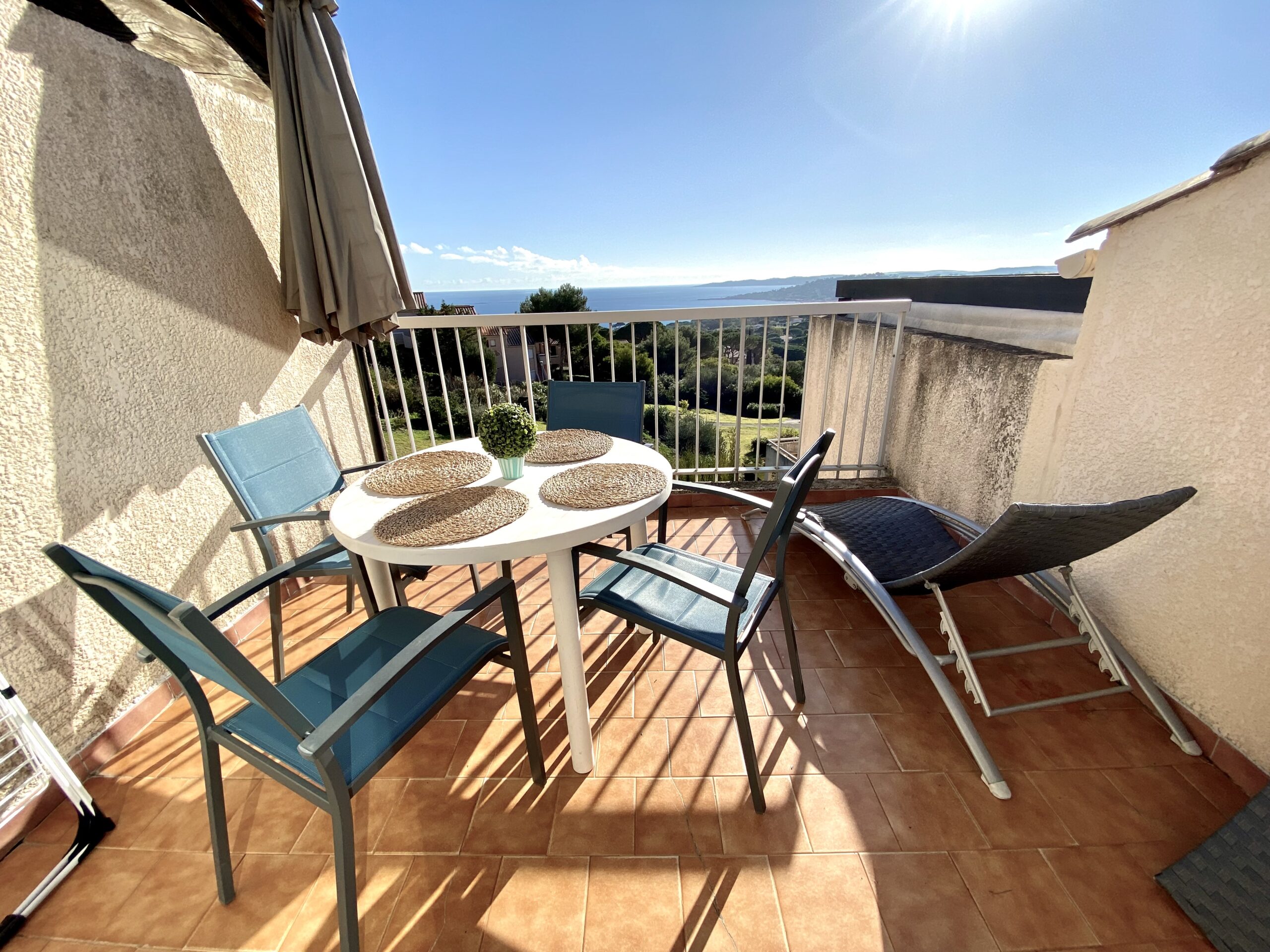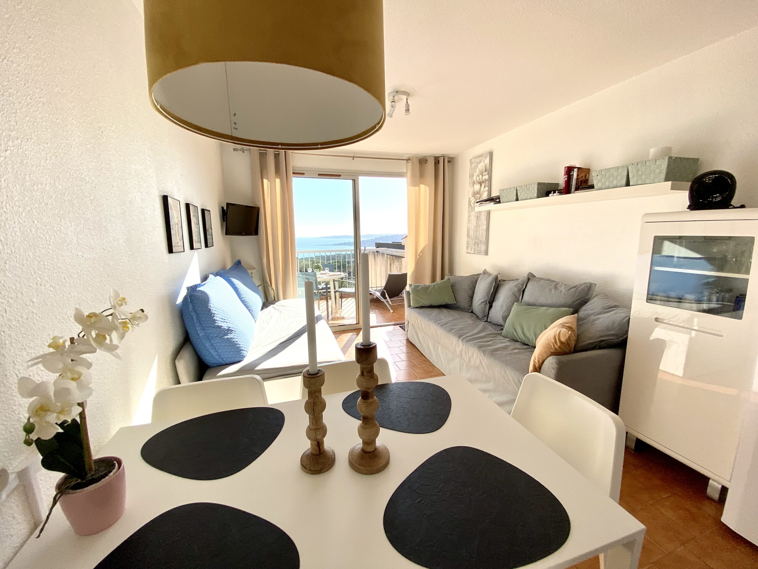 Lejligheden i Sainte-Maxime er på ca. 40 m² og har en skøn terrasse med udsigt til indsejlingen til Saint-Tropez-bugten. Her kan du starte dagen med en kop kaffe i solen eller nyde en middag under åben himmel, mens du ser lyset ændre sig over Middelhavet.