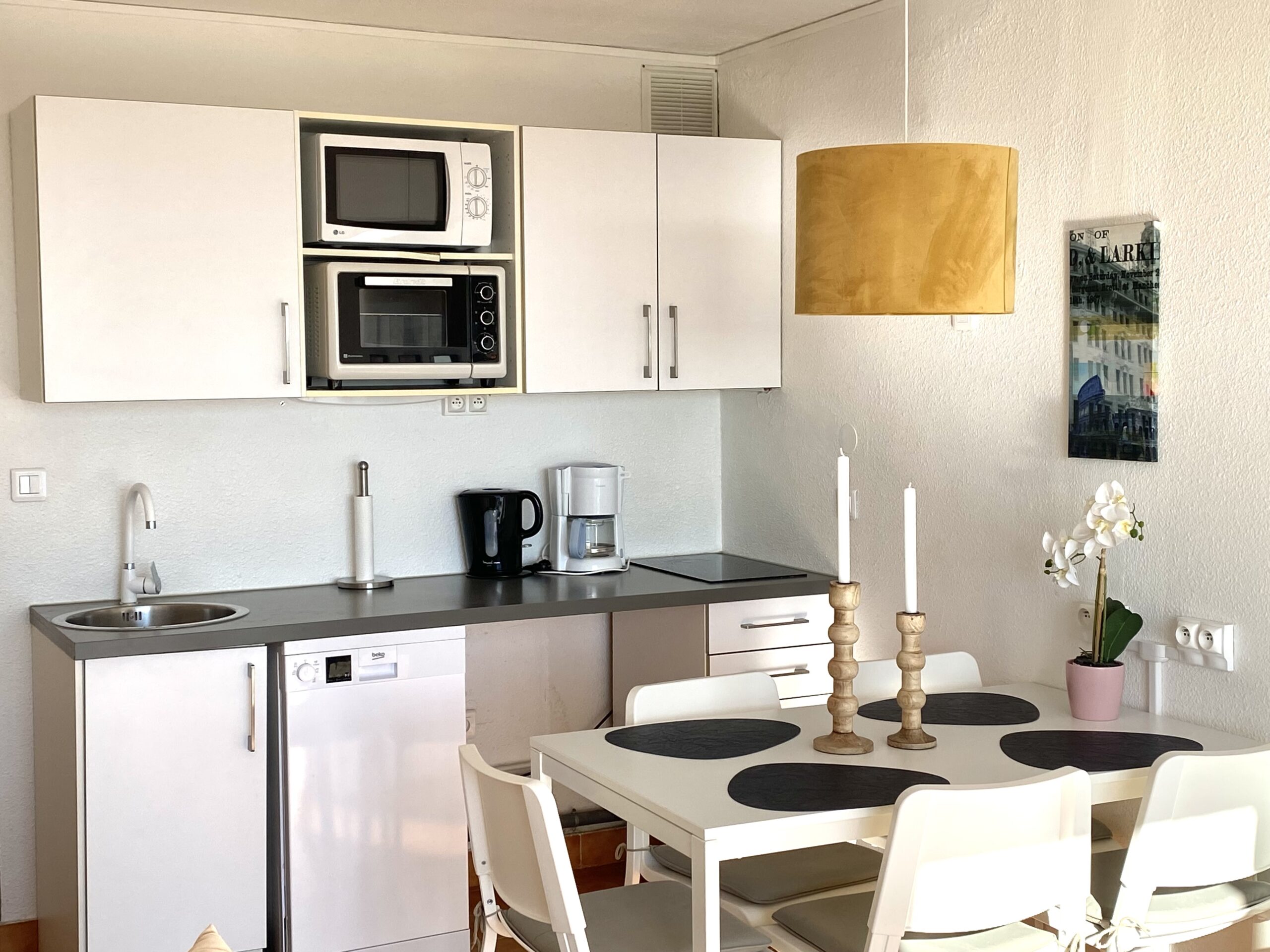 Fin lejlighed med mindre køkken. Vi havde begge lejligheder til familie med tre store børn/unge. Denne lejlighed har en solrig men lidt mindre terrasse, mens 309 har bedre plads til måltider i skyggen på terrassen . Vi syntes godt om den nærmeste strand til en morgendukkert (10 min gang) og den store strand til længere badedage (20 min gang). Mange fisk, husk snorkelsæt!